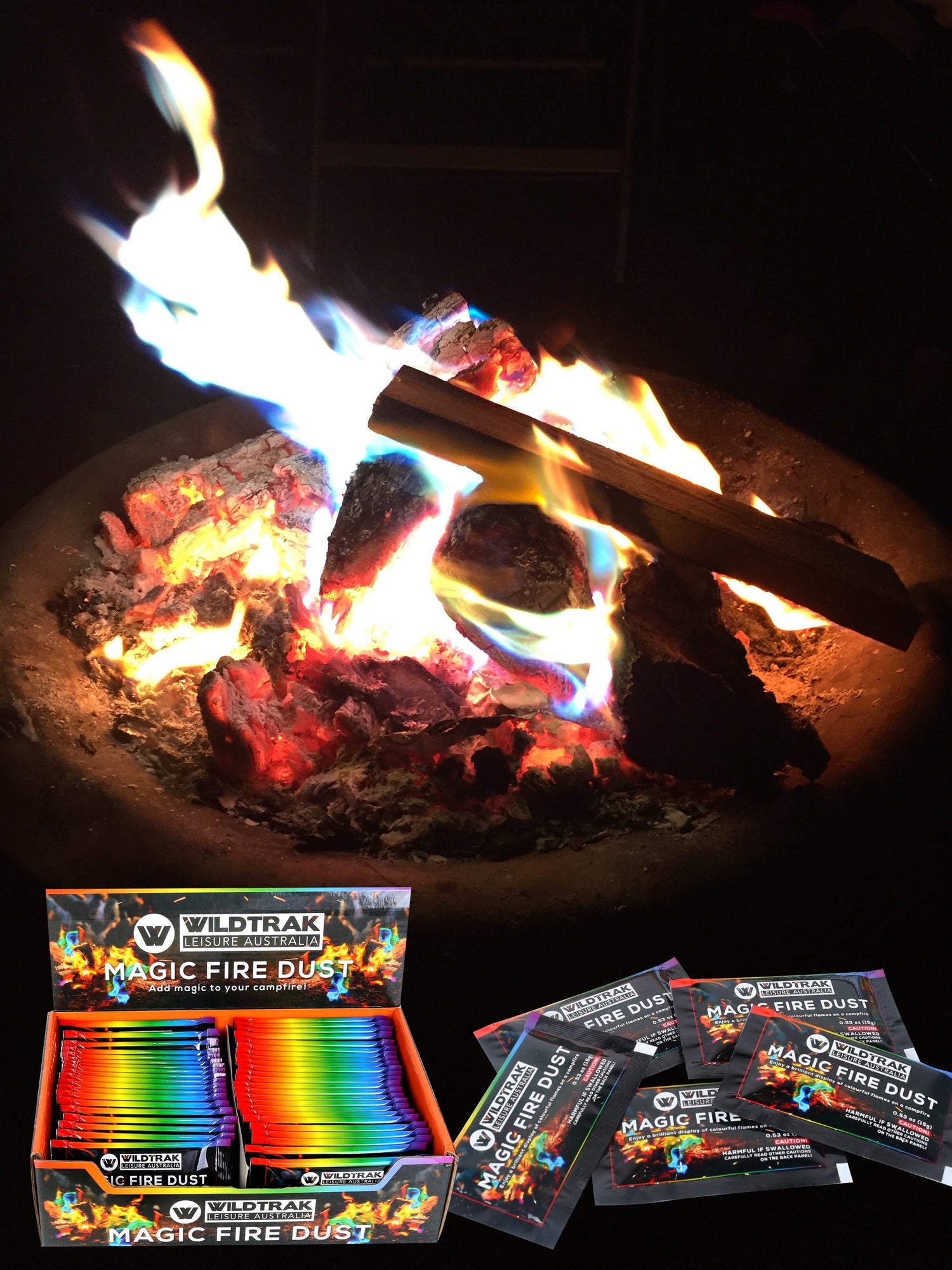 15g sachet, Coloured flame effect, Counter display packaging, Safe campfire additive, Fun camping entertainment